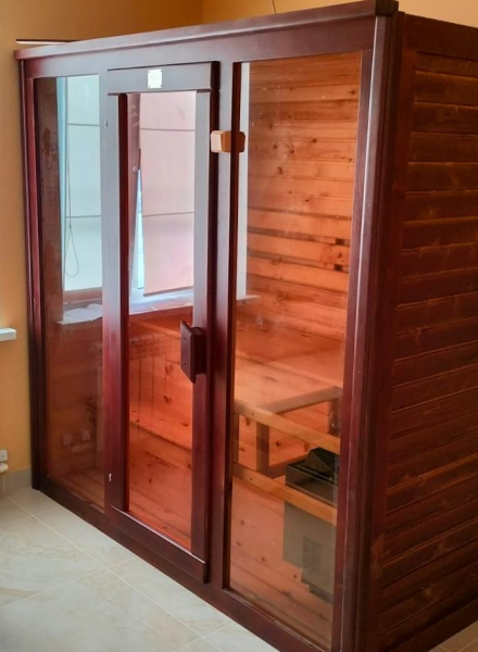 Это специально оборудованная кедровая кабина для прогрева тела человека сухим теплом. Воздух в таких парных не нагревается. Инфракрасные лучи воздействуют на тело, равномерно прогревая мышцы, суставы и органы. Карбоновые излучатели, встроенные в стены кабины, обладают мягким прогревом, что полностью исключает возможность ожога. Работает кабина за счет электричества. Инфракрасная сауна с карбоновыми излучателями подойдет как для домашнего использования, так и для коммерции.