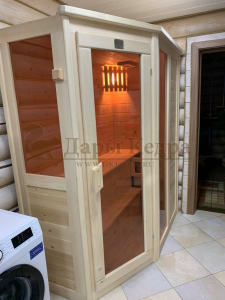 Купили такую сауну к себе в квартиру, установили в ванной, смотрится очень здорово, не можем налюбоваться))) Принимаем процедуры всей семьей из 4-х человек, вполне умещаемся. Один-два раза в неделю любим с детьми посидеть немного, перед сном хорошо расслабляет возбужденных деток. Спасибо Дарам Кедра за "здоровые" изделия!